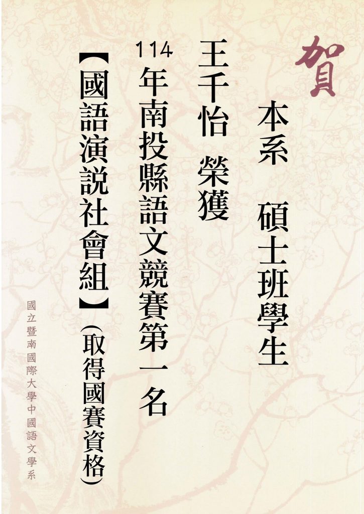 賀!碩士班學生王千怡 榮獲114年南投縣語文競賽第一名