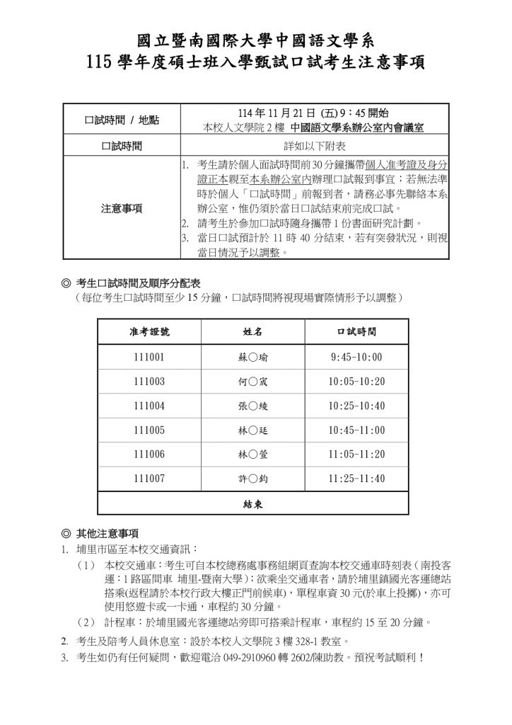 115學年度碩博士班入學甄試通過初審名單及考生注意事項