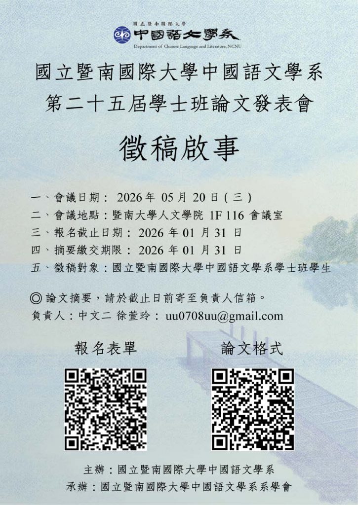 各位老師、同學們大家好,我們是中文系系學會學術組,協助籌辦第二十五屆學士班論文發表會。
