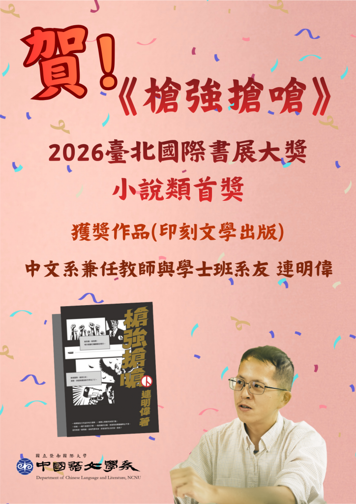 國立暨南國際大學中文系畢業校友 連明偉(任職本系小說課助理教授),以作品《槍強搶嗆》(印刻文學出版)榮獲 2026台北國際書展大獎小說類首獎!