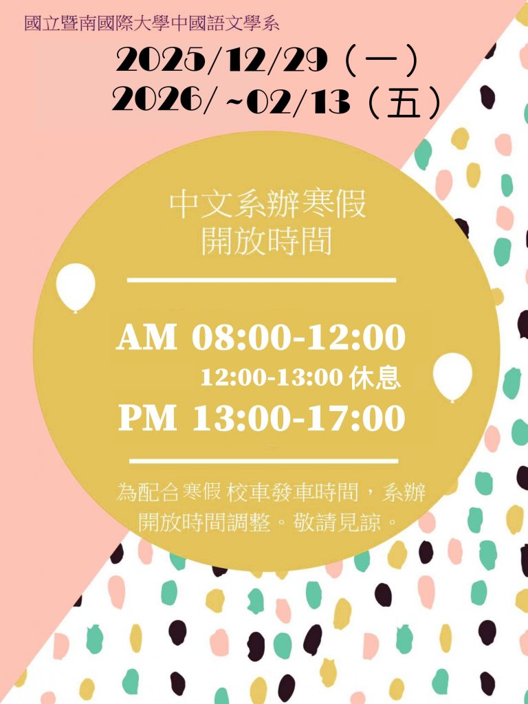 寒假2025/12/29(一)至2026/02/13(五)中文系辦公室行政服務時間調整為8:00-12:00、13:00-17:00,中午休息12:00-13:00。請各位注意時間,以免白跑一趟! 出門旅遊或從事任何活動,也需注意交通安全並保持身體健康。 114-2學期開學日接在過年完的2月23日(一),祝大家寒假愉快!