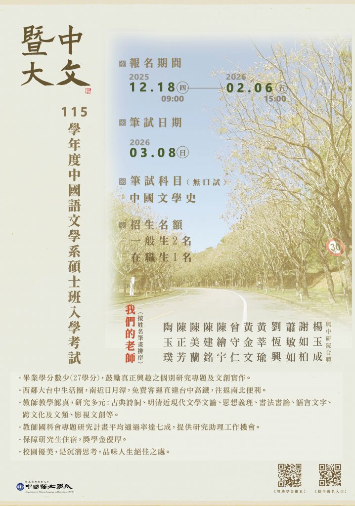 115學年度國立暨南國際大學中國語文學系 碩、博士班入學甄試